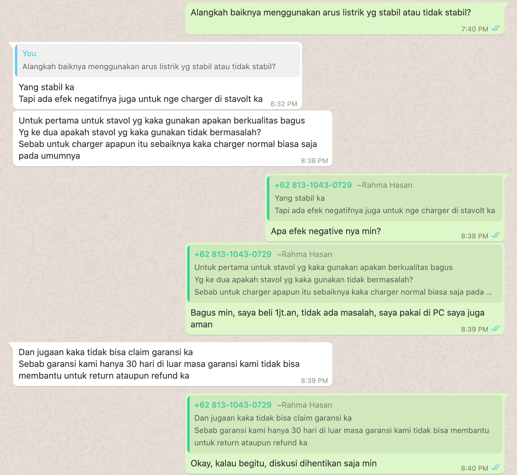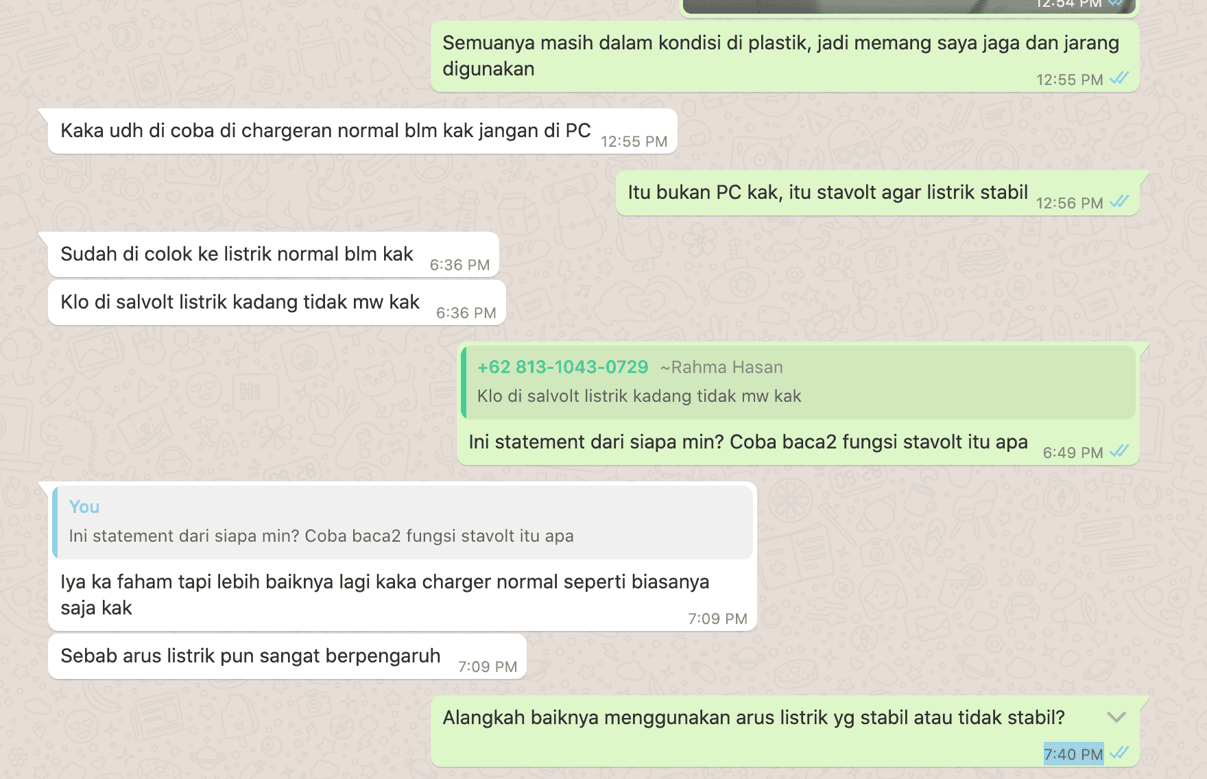 Akhirnya saya dihubungi teknisi iColor melalui WhatsApp. Begini percakapan saya dengan teknisi iColor