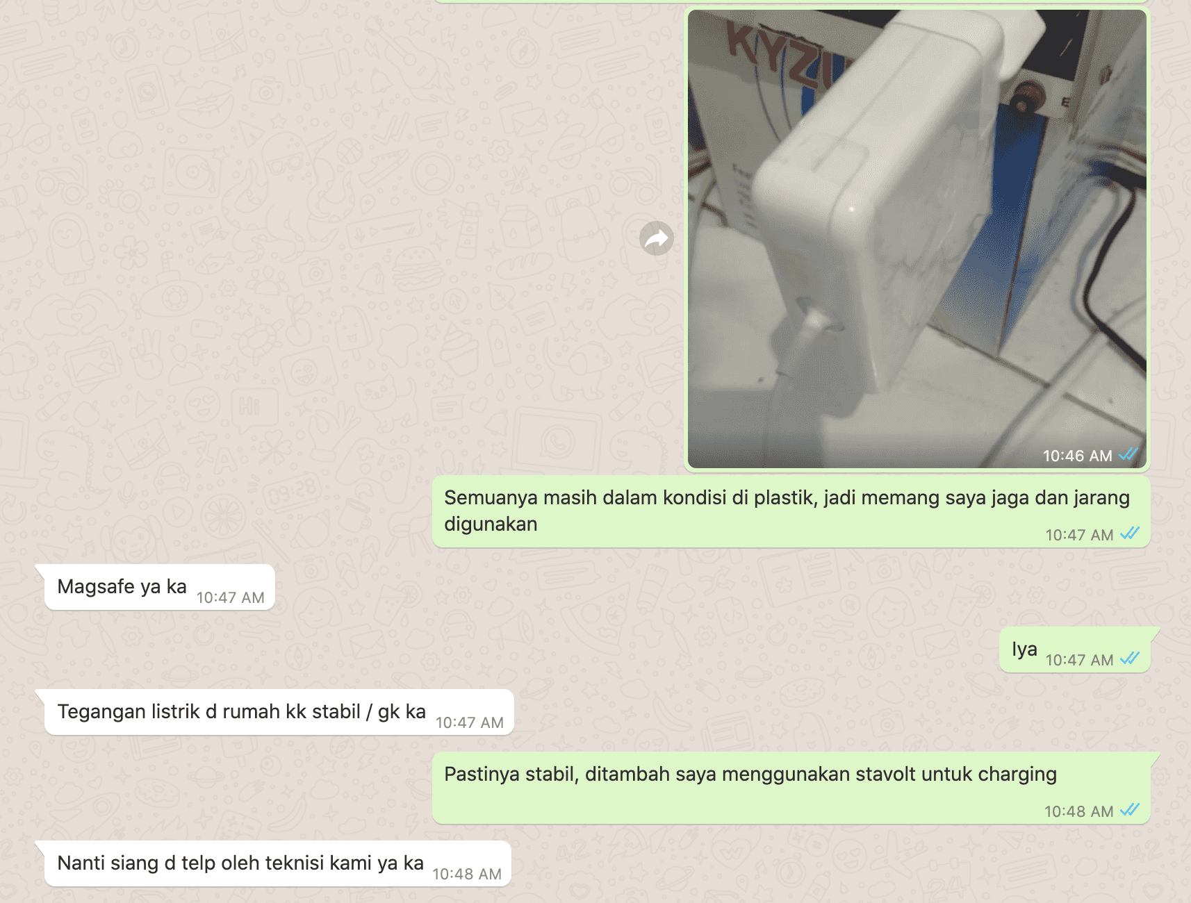 Besoknya saya mendapat telepon dari teknisi iColor, saya mengkonfirmasi ulang mengenai originalitas barang dan menanyakan perihal Magsafe yang sangat amat panas.