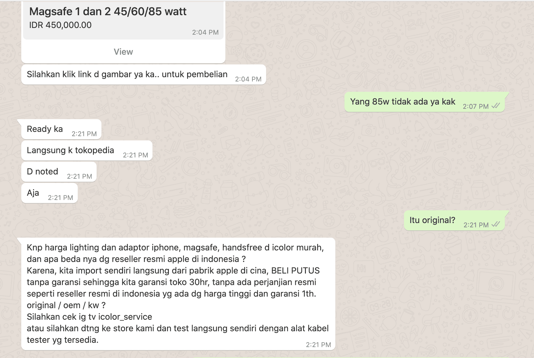 Saya menemukan beberapa seller di marketplace dengan jaminan Magsafe yang mereka jual original. Dan yang membuat saya tertarik adalah seller dengan nama "iColor", seller tersebut menjual Magsafe2 seharga Rp 450.000 dengan jaminan original. Selain itu alasan saya membuat saya tertarik dengan seller "iColor" ini karena Gibran yang merupakan Putra dari presiden kita saat ini, menjadi salah satu pemiliki "iColor".