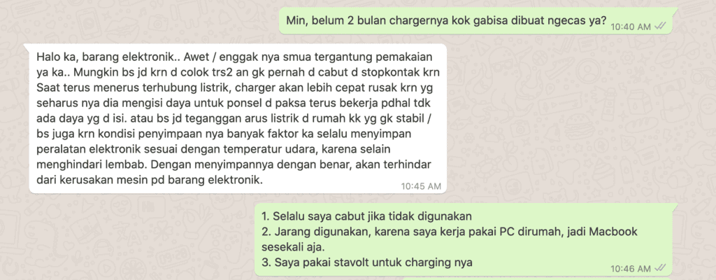 Untuk masalah charger Macbook yang saya alami, mungkin saya lagi apes, dan saya rasa harus berpikir 2kali atau tidak lagi untuk membeli charger Macbook disini.
