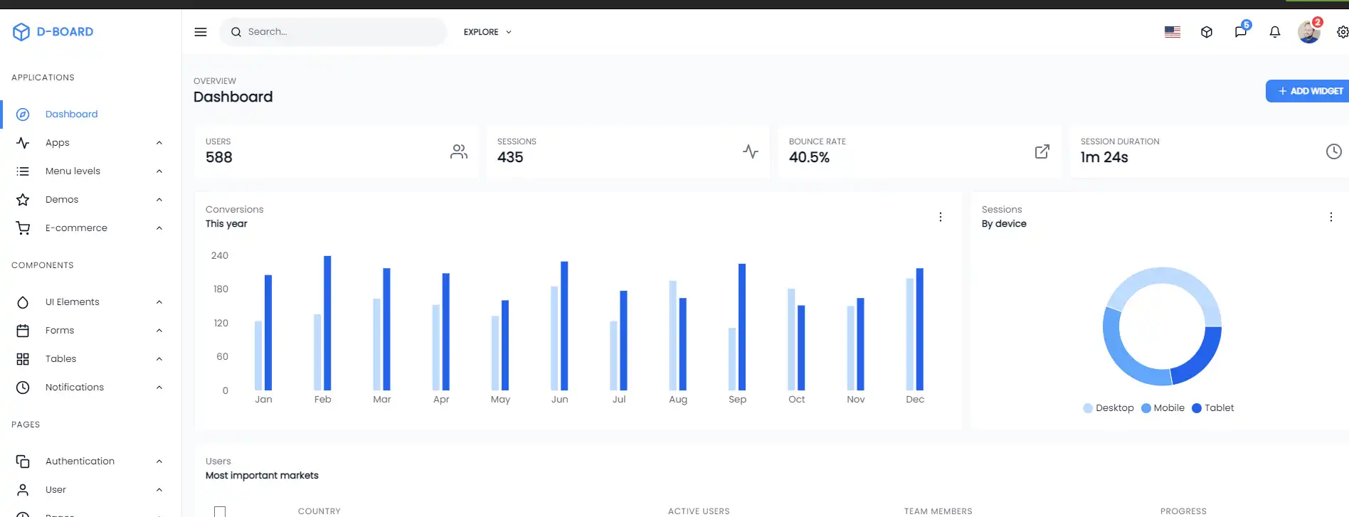 D-Board is on top of Next.js, Redux, and Tailwind CSS, D-board is a responsive dashboard template with a high level of sophistication. Additionally, it comes with more than a hundred elements (for each layout) and various reusable widgets to assist you in building your next Tailwind project or online application.