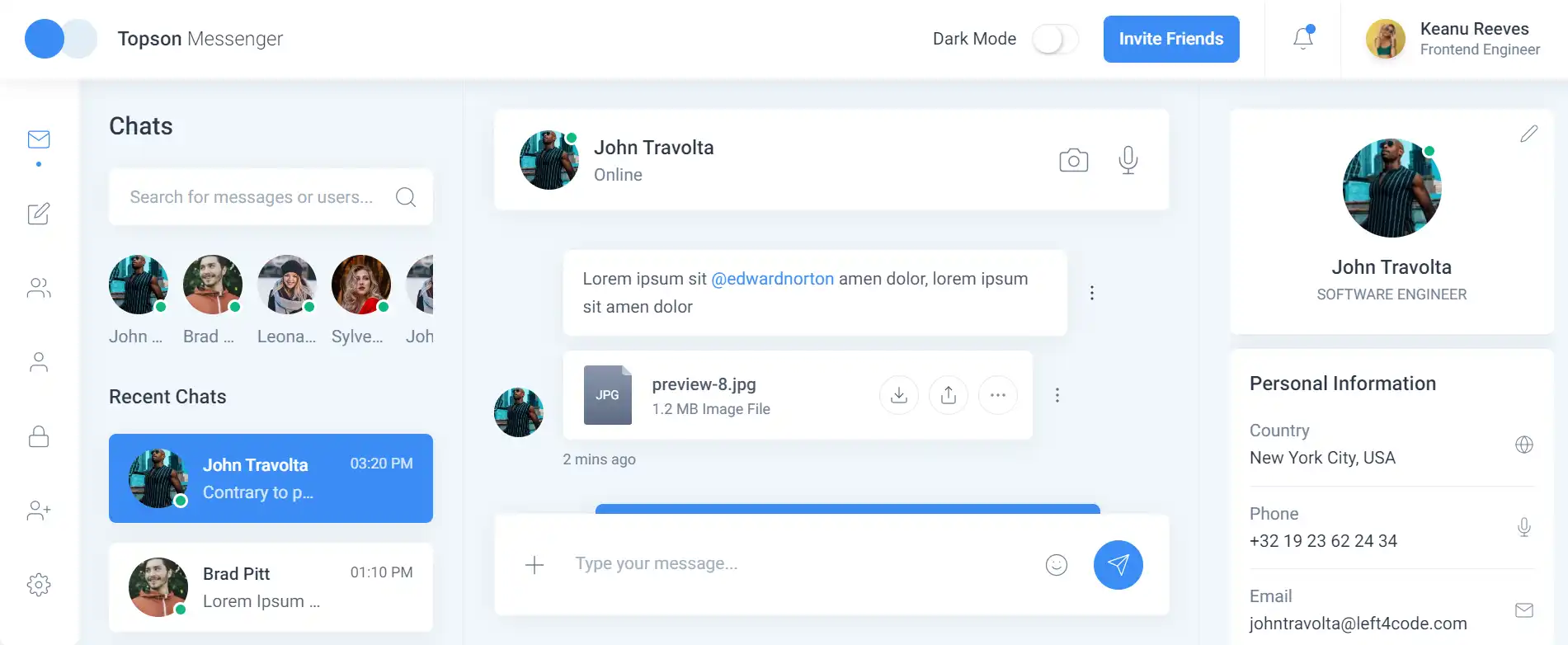 Topson Template for the messenger dashboard that is fully responsive. Designed with care to accommodate a variety of devices. As well as individual sites and components, it makes it easy to create Chat Messenger Apps.