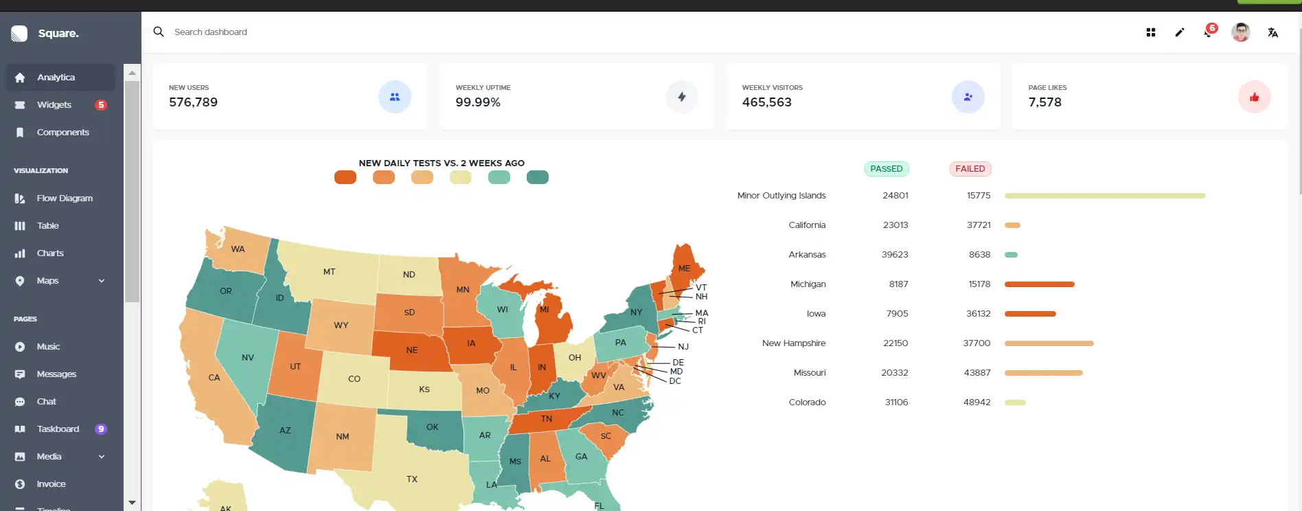 A React admin/dashboard template, Square Admin has a unique design. It supports light and dark color schemes, as well as SSR, right out of the box. It's designed using Tailwind's CSS library and can be tweaked to meet your needs.
