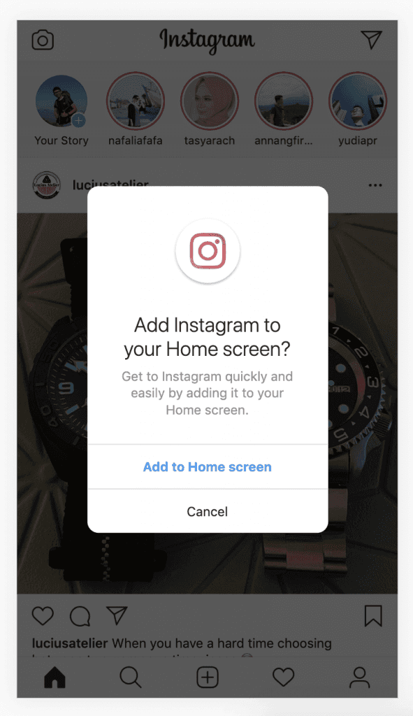 Keempat kalian harus refresh browser kalian, dan tampilan instagram akan menjadi seperti dibawah ini, dan akan muncul sebuah popup dengan permintaan untuk menambahkan Instagram ke Home screen kalian.