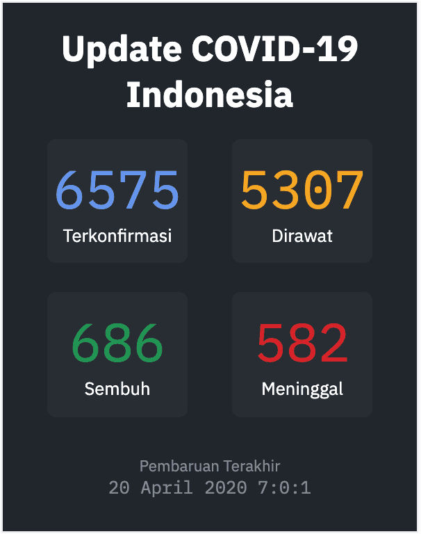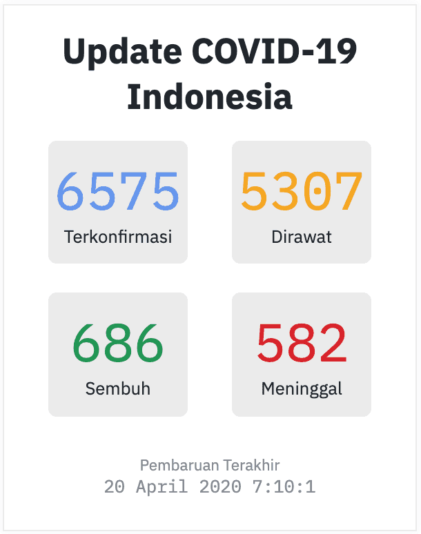 Dari background diatas, saya mencoba membuat sebuah widget yang dapat dipasang di website pribadi masing-masing. Widget yang saya buat dapat memberikan statistik COVID-19 yang ada di Indonesia saat ini.