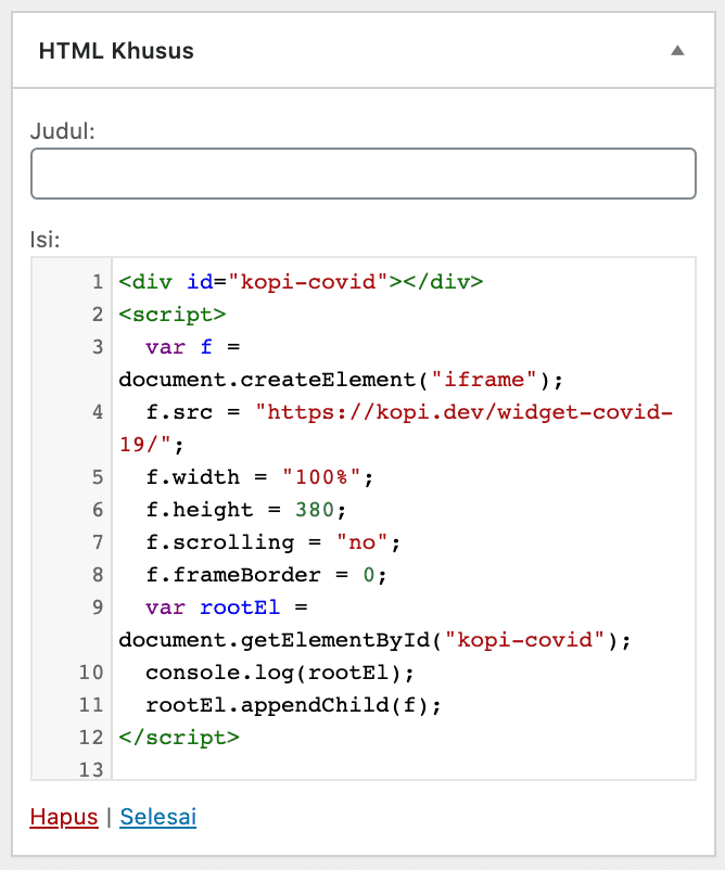 Untuk mengatur ketinggian widget kawal corona, kalian dapat mengubah nilai ketinggian pada baris f.height = 380; , dan untuk menggunakan widget kawal corona berwarna gelap, kalian dapat mengubah url pada baris f.src = "https://kopi.dev/widget-covid-19/"; menjadi f.src = "https://kopi.dev/widget-covid-19/?dark=true";