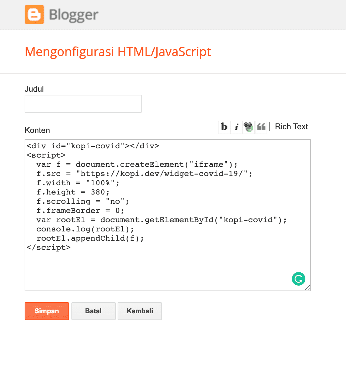 Lalu tambahkan script diatas tadi kedalam kolom Konten, seperti ini: